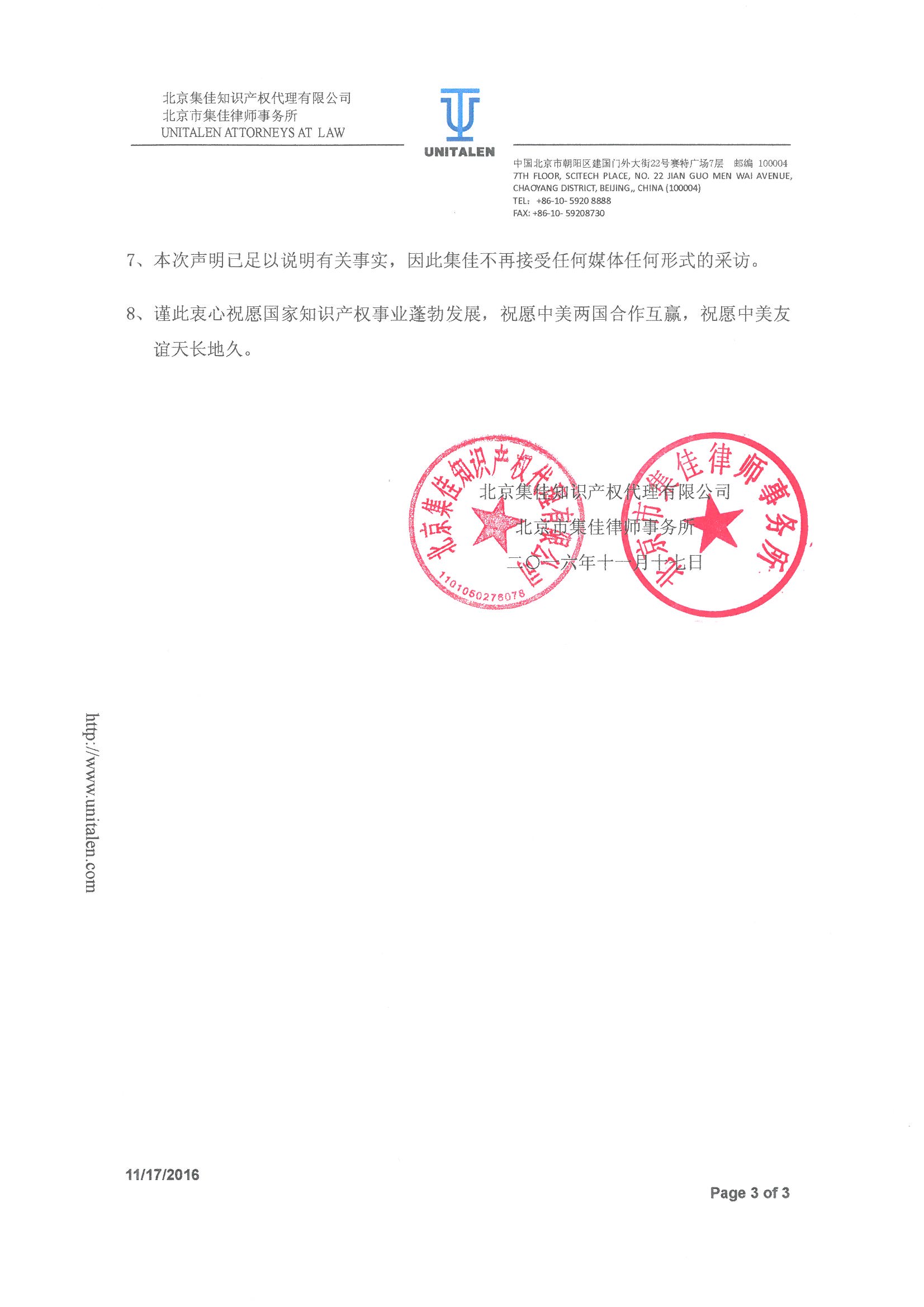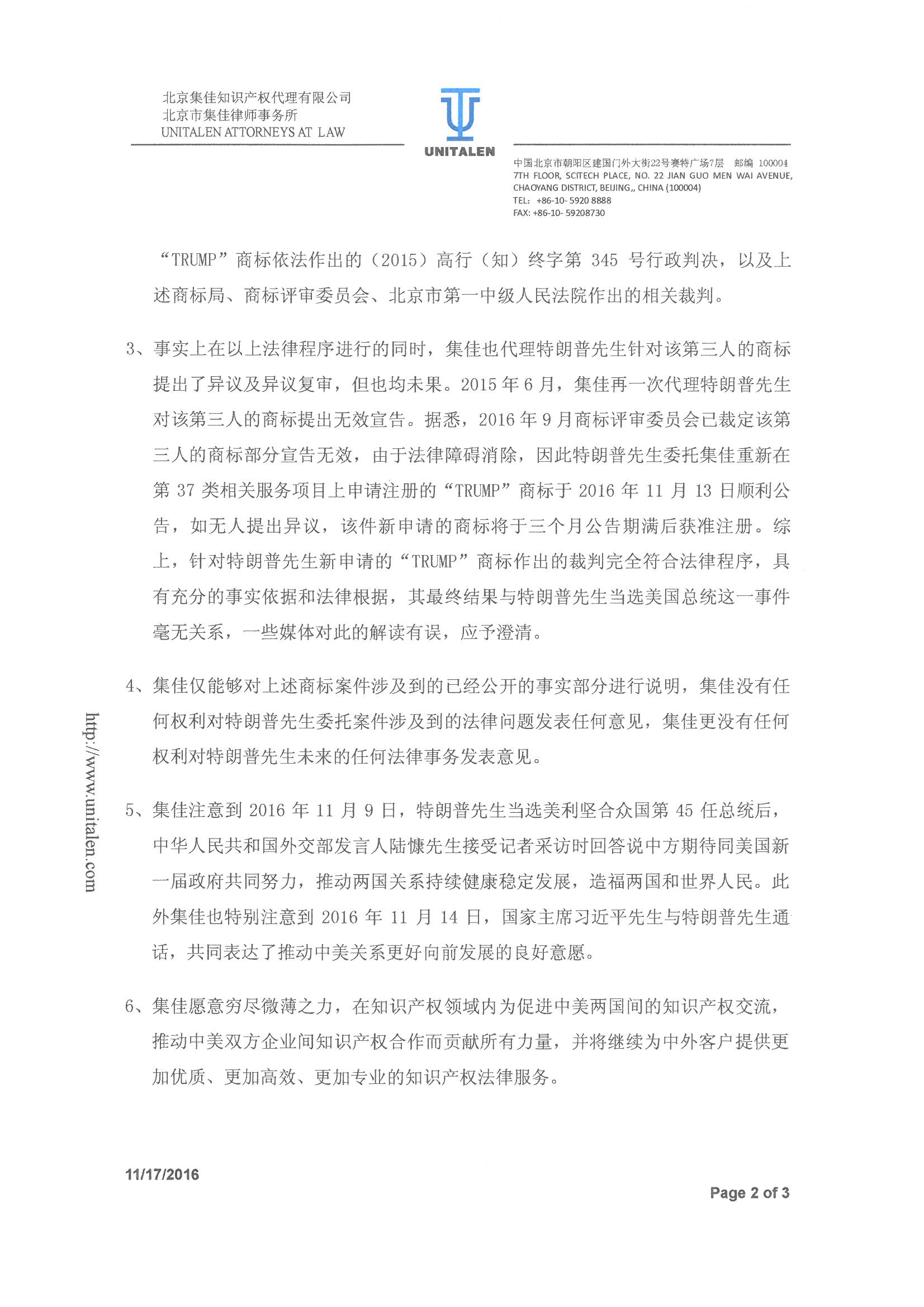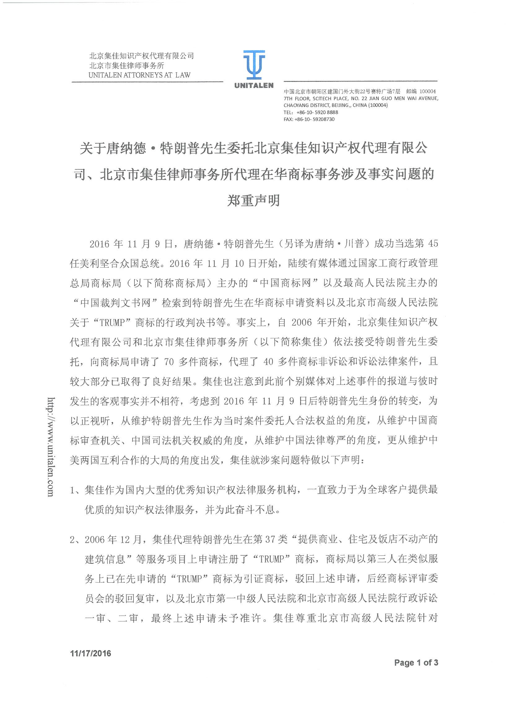 關(guān)于唐納德·特朗普先生委托北京集佳知識(shí)產(chǎn)權(quán)代理有限公司、北京市集佳律師事務(wù)所代理在華商標(biāo)事務(wù)涉及事實(shí)問(wèn)題的鄭重聲明 .pdf