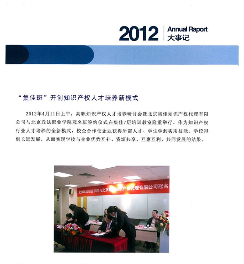 在北京市知識產權局近期公布的《2012年度北京市專利代理年報》中,“‘集佳班’開創(chuàng)知識產權人才培養(yǎng)新模式”入選2012年行業(yè)大事記。