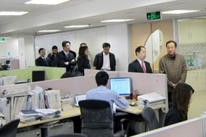 市知識產(chǎn)權(quán)局領(lǐng)導(dǎo)在集佳領(lǐng)導(dǎo)的陪同下,首先參觀了位于賽特廣場七層、八層的集佳辦公區(qū),了解了集佳專利、商標(biāo)等業(yè)務(wù)部門及流程部門的工作,并對集佳在專利代理、知識產(chǎn)權(quán)訴訟以及流程管理等方面的工作給予了肯定。參觀過程中,汪洪局長還對專利時限監(jiān)控、案卷管理、卷庫規(guī)劃等細(xì)節(jié)問題,與于澤輝所長進行了深入交流。