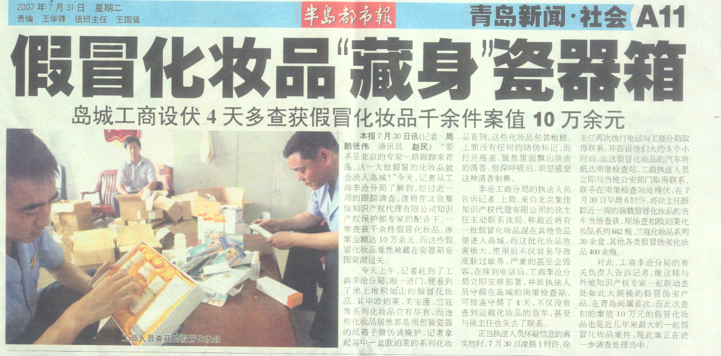 7月底,經過近一周的跟蹤調查,青島市工商李滄分局在與北京集佳知識產權代理有限公司的配合下,一舉查獲千余件假冒化妝品,涉案金額達10萬余元。此次查獲的假冒化妝品包括:歐珀萊、美寶蓮、蘭寇等系列高中檔產品。