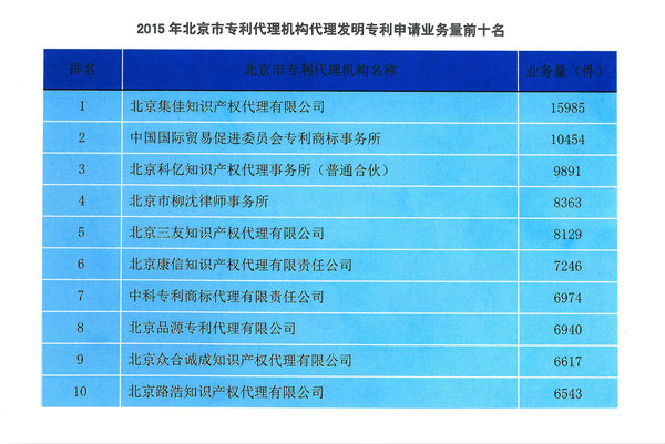 北京市知識產權局發布《2015年度北京市專利代理年報》,在北京專利代理機構業務排名中,集佳以代理量15985件的成績在發明專利申請量中再次排名第一,并在專利申請業務總量中排名第二。此外,經過專家評審,集佳憑借綜合的業務能力和優質的專業服務,連續三年入選“北京市優秀專利代理機構”。