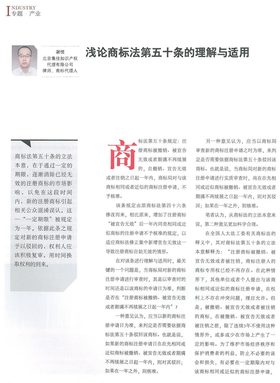 集佳代理人文章《淺論商標法第五十條的理解與適用》在《中國知識產(chǎn)權(quán)》發(fā)表