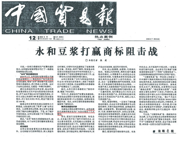 《中國貿(mào)易報》:永和豆?jié){打贏商標(biāo)阻擊戰(zhàn)