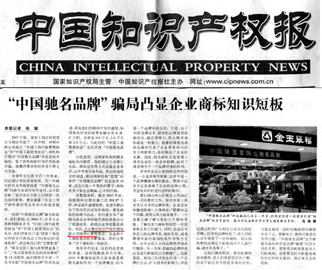 《中國(guó)知識(shí)產(chǎn)權(quán)報(bào)》:"中國(guó)馳名品牌"騙局凸顯企業(yè)商標(biāo)知識(shí)短板