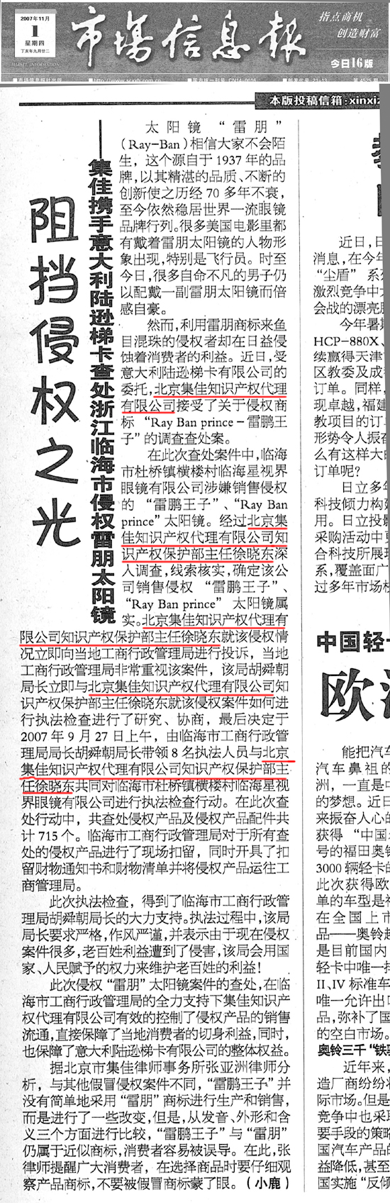 《市場信息報》:阻侵權之光——雷朋太陽鏡打假維權