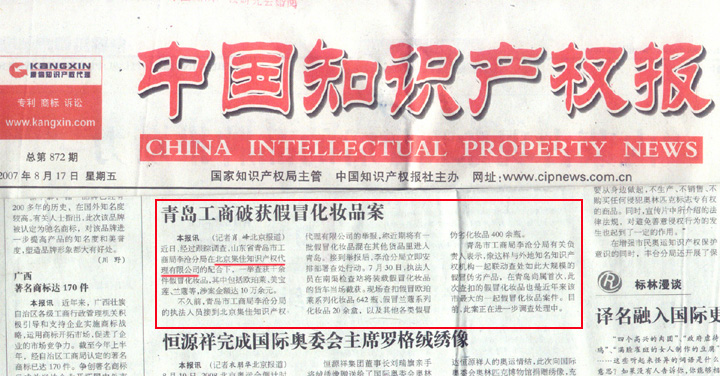 《半島都市報》、《中國知識產權報》:集佳聯合青島市李滄工商分局破獲大規模假冒化妝品案