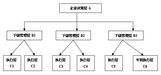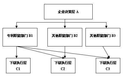 職能式專利管理組織架構明顯不同于直線式架構,其專利管理部門位階已經與其他職能部門相同,專利管理部門與企業內部的行政、技術研發、新產品推廣、戰略部門等平行設置。其最大的特點是,專利管理部門可以直接向其他職能部門的下級管理層下達任務并聽取匯報。這樣就克服了直線式專利管理組織架構中因某一產品的專業性太強而帶來的種種弊端。專利管理部門在新產品研發過程中,其作用更加明顯,例如:企業決策層A下達“防漏電熱水器”技術公關給職能部門B2,由下級執行層C2執行,下級執行層C2接到任務后向專利管理部門B1匯報,該部門關注該技術攻關進展,實時提供專利侵權檢索、規避涉及、專利申報、技術秘密保護等各方面服務,做到避免重復研發,防止未來侵權風險等方面具有重大作用。
