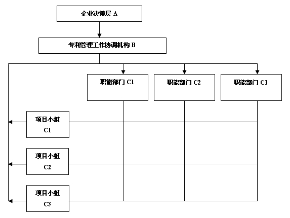 矩陣式組織結構最大的特點是采用“雙向權責結構”,打破了只能有一個上級管理部門的傳統組織架構體系。通過項目小組的跟蹤管理,能夠確保專利管理職能的及時和靈活,對技術的變化和市場的不確定性適應能力較強,有利于技術創新和專利競爭力的提升。舉例來說,項目小組C2在接到一項新產品的研發任務后,可以由專利管理協調部門B協調其他職能部門C1、C2、C3等,完成現有技術檢索、研發人員調配、規避設計統籌等工作,確保突破研發思維定勢,并對市場動態進行分析跟蹤,確保市場上沒有侵權現象。另外,項目小組C2不僅僅接受各職能部門的管理和考核,也增強了直接向協調機構進行匯報和討論的權力。