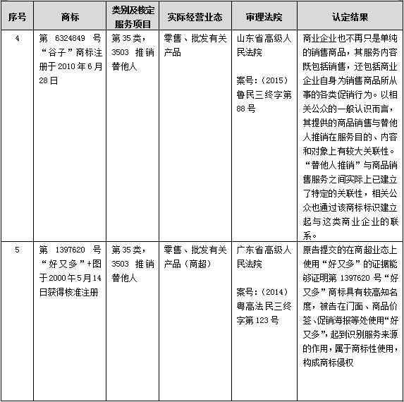 坦白地講,由于我國商標注冊主管機關并未準予在批發零售服務上注冊商標,因此司法機關當然也不能越俎代庖。但根據“大悅城”、“好又多”、“京客隆”等商標侵權案件在司法實踐中確立的規則可知,在遵守目前區分表的既有規定以及尊重商標授權確權行政主管機關獨立行使審查權的情況下,可行的解決方案是,考慮到批發零售與推銷替他人之間客觀上存在密切的關聯關系,故,基于注冊商標禁用權保護的需要,將批發零售與推銷替他人認定為類似服務,從而為那些在第35類推銷替他人服務上已注冊的知名度高、顯著性強的商標提供對等保護。以下是選取的基于“推銷替他人”保護批發零售及的案例: