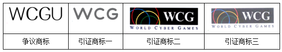 首先,對比系爭商標與引證商標一,雖然系爭商標由四個字母構成,引證商標由三個字母構成,但是系爭商標前三個字母與引證商標完全相同,屬于《商標審查審理指南》5.1.9 對于“個別字母不同”中的“增加或者減少字母”的解釋范圍。對比系爭商標與引證商標二、三,雖然系爭商標由四個字母構成,引證商標除了“WCG”還包含其他文字及圖形,但是,引證商標二、三包含的“WCG”獨立于其他文字及圖形,且為引證商標二、三的顯著識別文字。系爭商標前三個字母與引證商標顯著識別文字完全相同,屬于《商標審查審理指南》5.1.15 規定的情形。