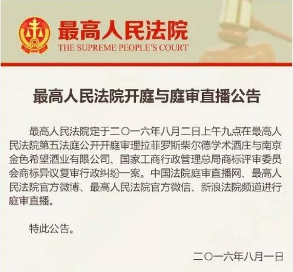 2016年8月1日最高法院通過其官方微博發(fā)布公告,公布了2016年8月2日將對“拉菲莊園”案開庭與庭審直播的消息。8月2日當(dāng)日,庭審?fù)ㄟ^中國法院庭審直播網(wǎng)、最高法院官方微博、最高法院官方微信、新浪法院頻道進(jìn)行了全程直播,庭審持續(xù)了5個多小時。