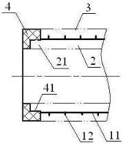 如圖1所示,基于該背景技術,本申請的申請人提出了一種新型的鋼骨架塑料復合管,其權利要求1的技術方案為:一種鋼骨架塑料復合管,包括經線(11)和緯線(12)組合而成的鋼絲網(1),所述鋼絲網(1)的內、外兩側分別設置有內層塑料(2)和外層塑料(3),所述外層塑料(3)的端部與所述鋼絲網(1)的端部平齊,其特征在于,所述內層塑料(2)具有突出于所述鋼絲網(1)的端部的突出部(21)。