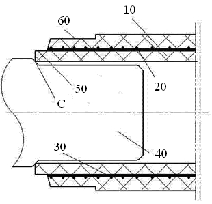 如圖2所示,對比文件1的具體方案為:包括直管10,設于直管10內的以緯線20和經線30組成的鋼網骨架,設于直管10一端外側的封位60,位于所述封位60一端的直管10外側還設有去除緯線20和經線30的臺階50。