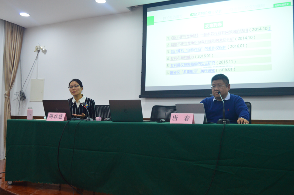 2017年11月12日上午9點(diǎn)半,第三屆“華政·集佳”杯綜述競賽系列學(xué)術(shù)活動(dòng)之“知識(shí)產(chǎn)權(quán)論文寫作與投稿”專題講座在長寧校區(qū)交誼樓第三會(huì)議室進(jìn)行。講座主講人為《電子知識(shí)產(chǎn)權(quán)》資深編輯周春慧老師,主持人為華東政法大學(xué)知識(shí)產(chǎn)權(quán)學(xué)院副院長唐春副教授。講座內(nèi)容分為撰寫與投稿兩個(gè)部分。在論文撰寫方面,周老師就 “選題”、“文獻(xiàn)查閱、收集、閱讀”、“結(jié)構(gòu)”、“撰寫”、“修改”、“成稿”六個(gè)方面進(jìn)行了詳細(xì)的介紹,指出了在相關(guān)撰寫過程中應(yīng)當(dāng)避免的常見錯(cuò)誤,講授了一篇好論文的具體撰寫方法。在投稿方面,周老師介紹了知識(shí)產(chǎn)權(quán)領(lǐng)域主要學(xué)術(shù)期刊的基本情況,以及各個(gè)期刊所偏好的論文題材,引導(dǎo)同學(xué)們有的放矢。在最后交流環(huán)節(jié),周老師對(duì)同學(xué)們的問題進(jìn)行了答疑解惑,與同學(xué)們進(jìn)行了進(jìn)一步的交流。