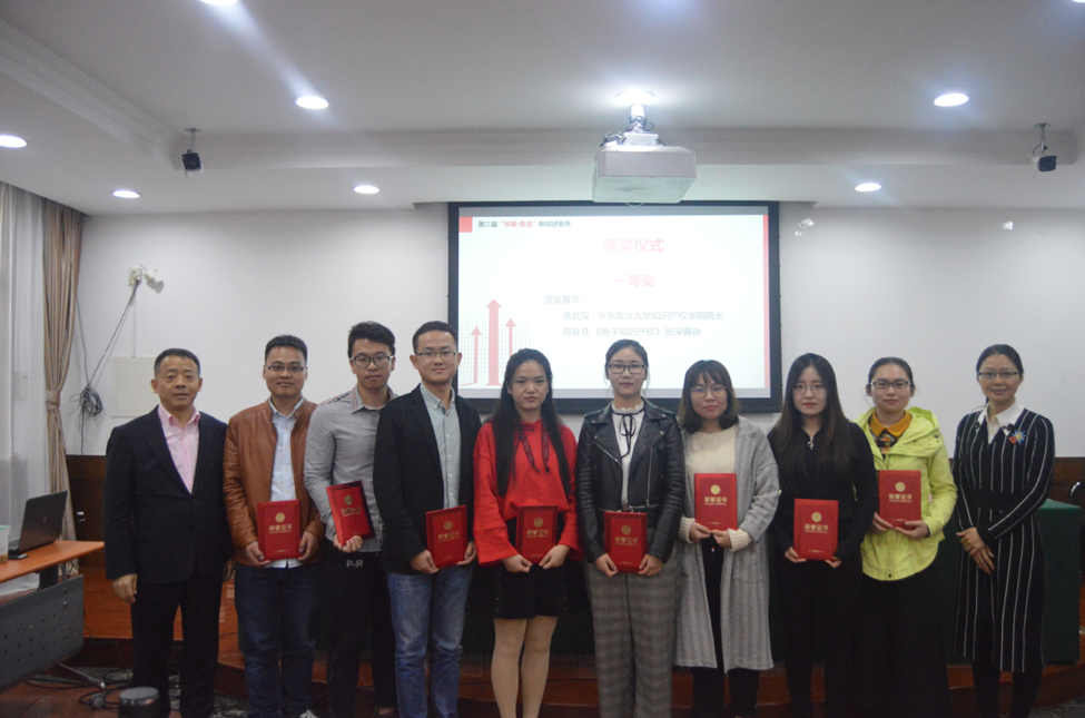 頒獎(jiǎng)環(huán)節(jié),由黃武雙教授、唐春副教授、李文紅律師、尹臘梅副教授、周春慧編輯、張韜略副教授、郭鵬鵬副教授為獲獎(jiǎng)?wù)哳C獎(jiǎng)。本次競賽共評(píng)出一等獎(jiǎng)4組,二等獎(jiǎng)6組,三等獎(jiǎng)8組,提名獎(jiǎng)27組,優(yōu)秀獎(jiǎng)30組。