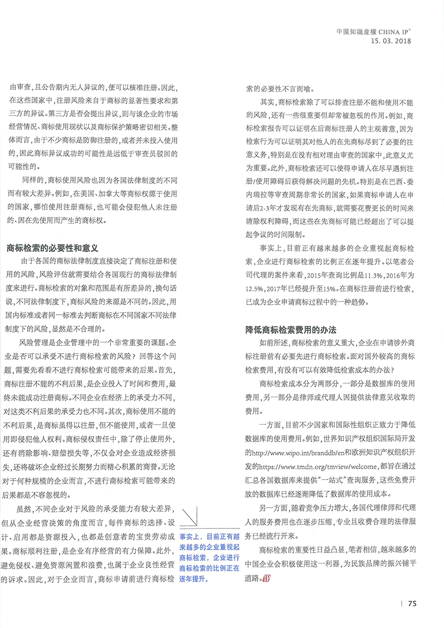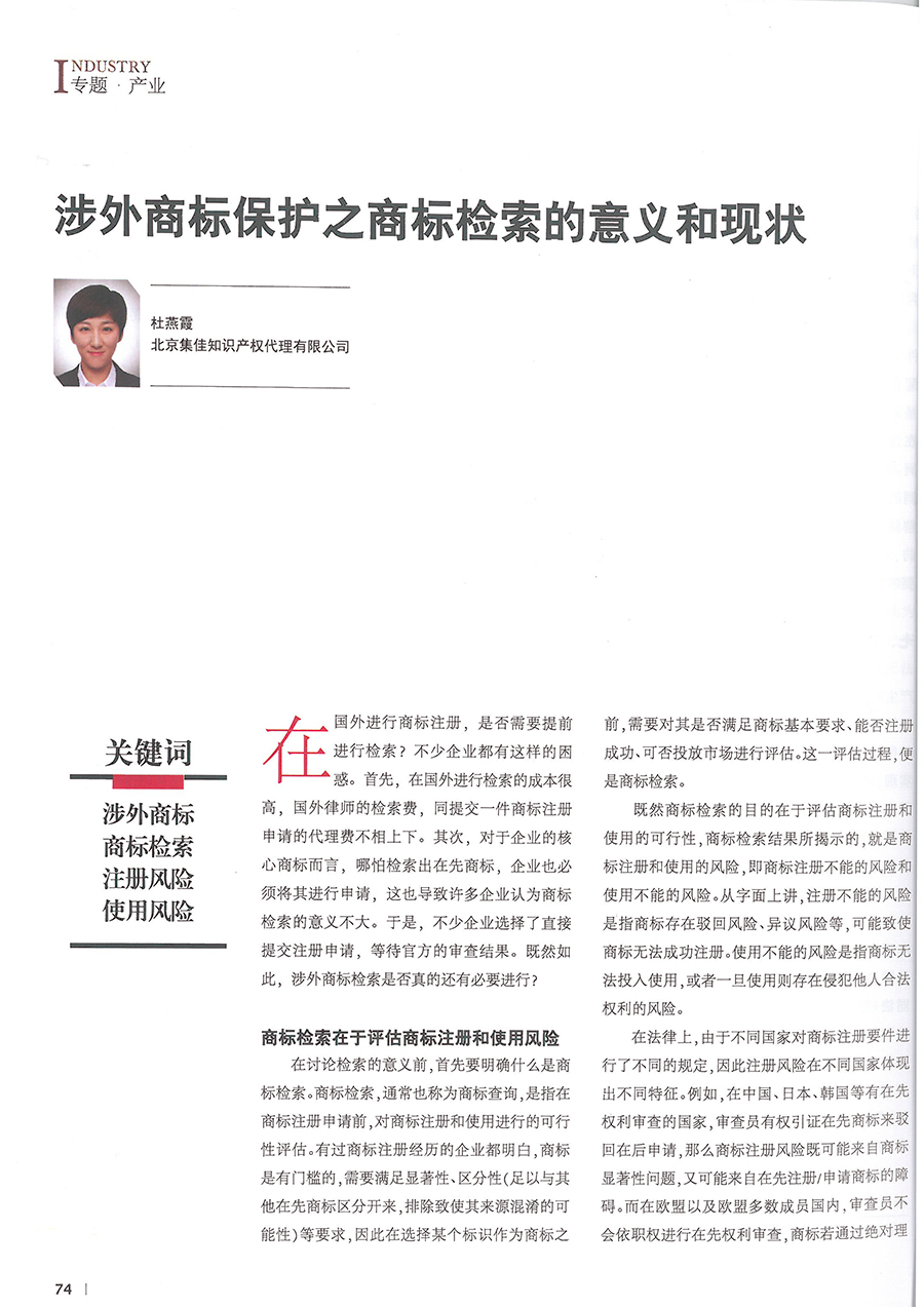 集佳文章《涉外商標(biāo)保護(hù)之商標(biāo)檢索的意義和現(xiàn)狀》在《中國知識產(chǎn)權(quán)》發(fā)表