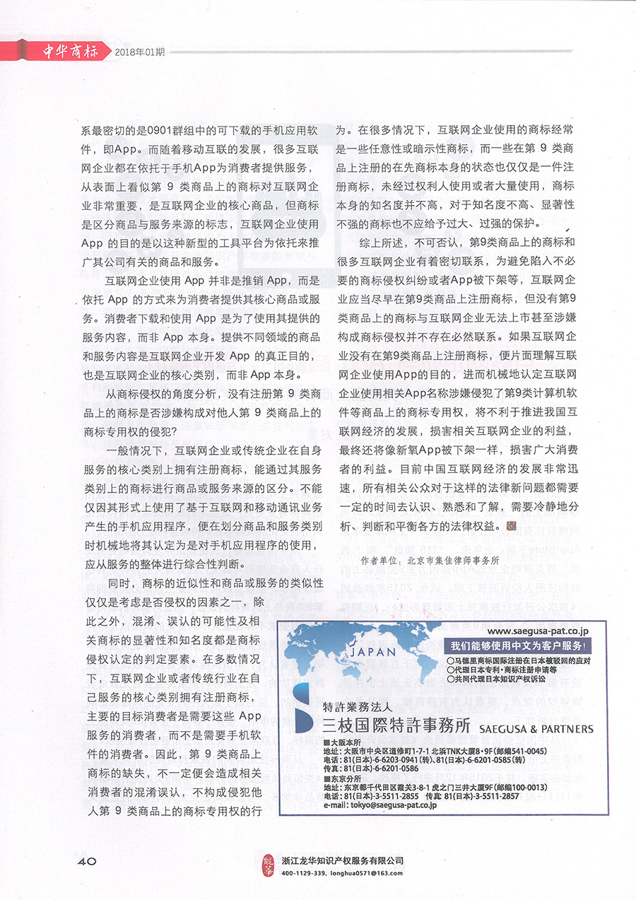 集佳文章《互聯網企業與APP商標的“愛恨情仇”》在《中華商標》發表
