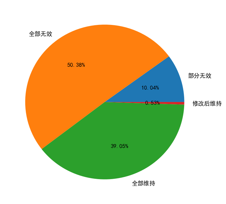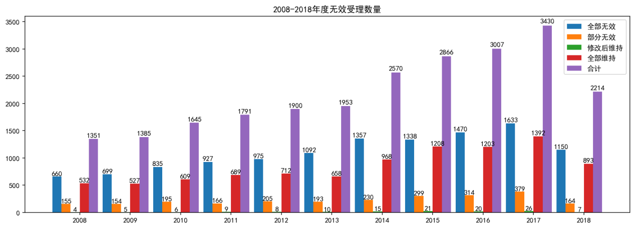 【2】需要說(shuō)明的是,復(fù)審委網(wǎng)站公開(kāi)的數(shù)據(jù)本身存在一些問(wèn)題(例如個(gè)別決定存在信息缺失錯(cuò)誤等,尤其是早期發(fā)布的無(wú)效決定信息錯(cuò)誤較多),因此,筆者在統(tǒng)計(jì)過(guò)程中剔除了一些錯(cuò)誤或無(wú)法使用的數(shù)據(jù),并重點(diǎn)統(tǒng)計(jì)了2008年后近十年的數(shù)據(jù)。考慮到數(shù)據(jù)的剔除以及編寫的算法可能存在的不足,下面的統(tǒng)計(jì)結(jié)果會(huì)存在一定誤差。另外,考慮到無(wú)效決定都是已經(jīng)完結(jié)的案件,下面的全部統(tǒng)計(jì)分析都沒(méi)有包括尚處于無(wú)效程序中的案件。