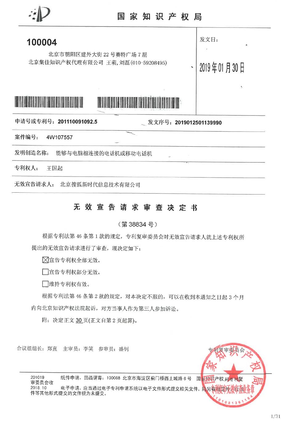 由于存在諸多特殊性,本案受到行業(yè)的高度關注。集佳公司接受搜狐公司委托,組建經(jīng)驗豐富的專利無效團隊,團隊成員深知該案的重要性,以高標準嚴要求的態(tài)度認真對待無效過程中的每個環(huán)節(jié),從前期對比文件檢索,到無效請求材料的準備,證據(jù)的補充,以及后期的口頭審理,承委托人之信任,擔盡力成事之責任,終于實現(xiàn)了委托人搜狐的期望,在新年來臨之前,收到復審委做出的無效決定。