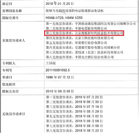 涉案專利名稱為“能夠與電腦相連接的電話機或移動電話機”,基于該專利,專利權人王國起自封“發(fā)漢字和圖像信息的電話機/移動電話機的全世界首創(chuàng)人”。2018年,王國起同時與中國移動、聯(lián)通、電信、搜狐、蘋果、華為、小米、錘子、農(nóng)行、交行等等30余家企業(yè)發(fā)生專利侵權行政糾紛,涉案金額共計數(shù)十億元之多。