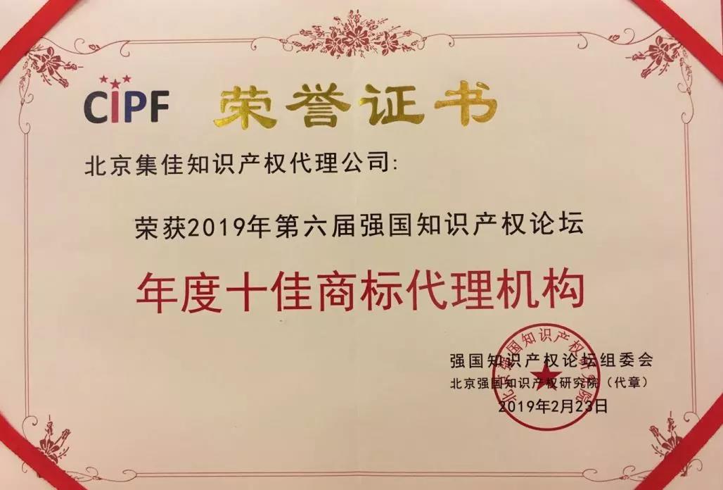 會上,強國知識產(chǎn)權論壇組委會對“2019強國知識產(chǎn)權論壇服務業(yè)‘十佳’進行了頒獎。組委會以“創(chuàng)新、協(xié)調(diào)、開放、共享”發(fā)展理念為指導,以“責任、創(chuàng)新、挑戰(zhàn)”為關鍵詞,以“創(chuàng)新力、影響力、發(fā)展力、經(jīng)營力”為評選標準,評選出2018年度在知識產(chǎn)權領域商標、專利和法律服務各方面做出突出貢獻的優(yōu)秀機構和個人。集佳以較強的專業(yè)服務水平、領先的實踐成果、前瞻的發(fā)展理念和創(chuàng)新的經(jīng)營思維獲得好評,入選“年度十佳商標代理機構”。