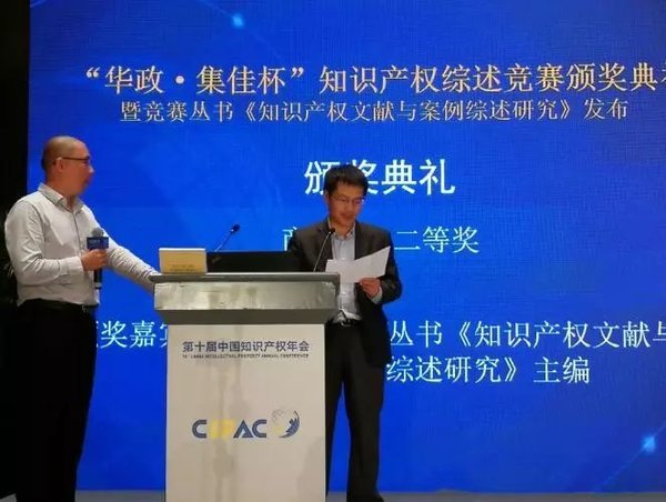活動由唐春老師和南京理工大學(xué)副教授、前國家專利復(fù)審委資深審查員郭鵬鵬老師共同主持。同時參加頒獎典禮的還有知識產(chǎn)權(quán)出版社劉睿主任等,阿里巴巴集團(tuán)、中知集團(tuán)的專家以及來自全國各地的與會專家和知識產(chǎn)權(quán)從業(yè)人士共同鑒證了頒獎典禮。