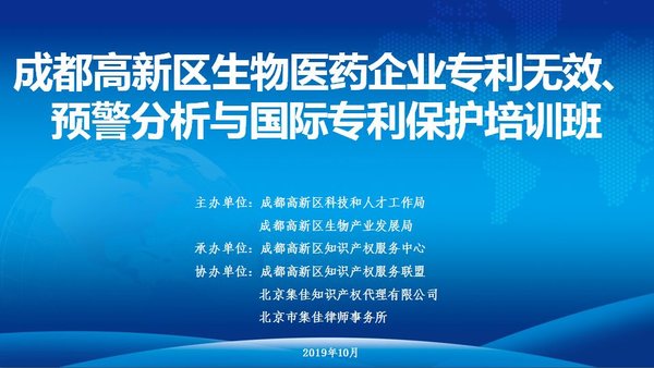 10月24日,由成都高新區科技和人才工作局、成都高新區生物產業發展局主辦,成都高新區知識產權服務中心承辦,成都高新區知識產權服務聯盟、北京集佳知識產權代理有限公司、北京市集佳律師事務所協辦的“成都高新區生物醫藥企業專利無效、預警分析與國際專利保護培訓”在高新區菁蓉匯順利舉行。本次培訓圍繞企業專利無效、預警分析、海外專利保護等熱點問題展開,旨在增強企業專利保護能力和意識,助力生物醫藥企業海外專利保護、推動生物醫藥產業發展。成都高新區100 余家知名生物醫藥企業、科研院所代表參加培訓。