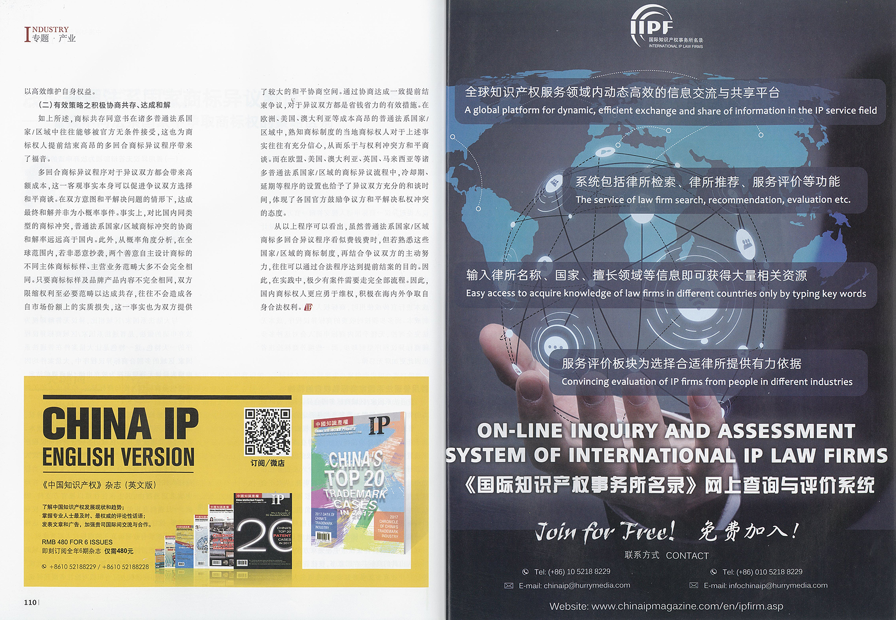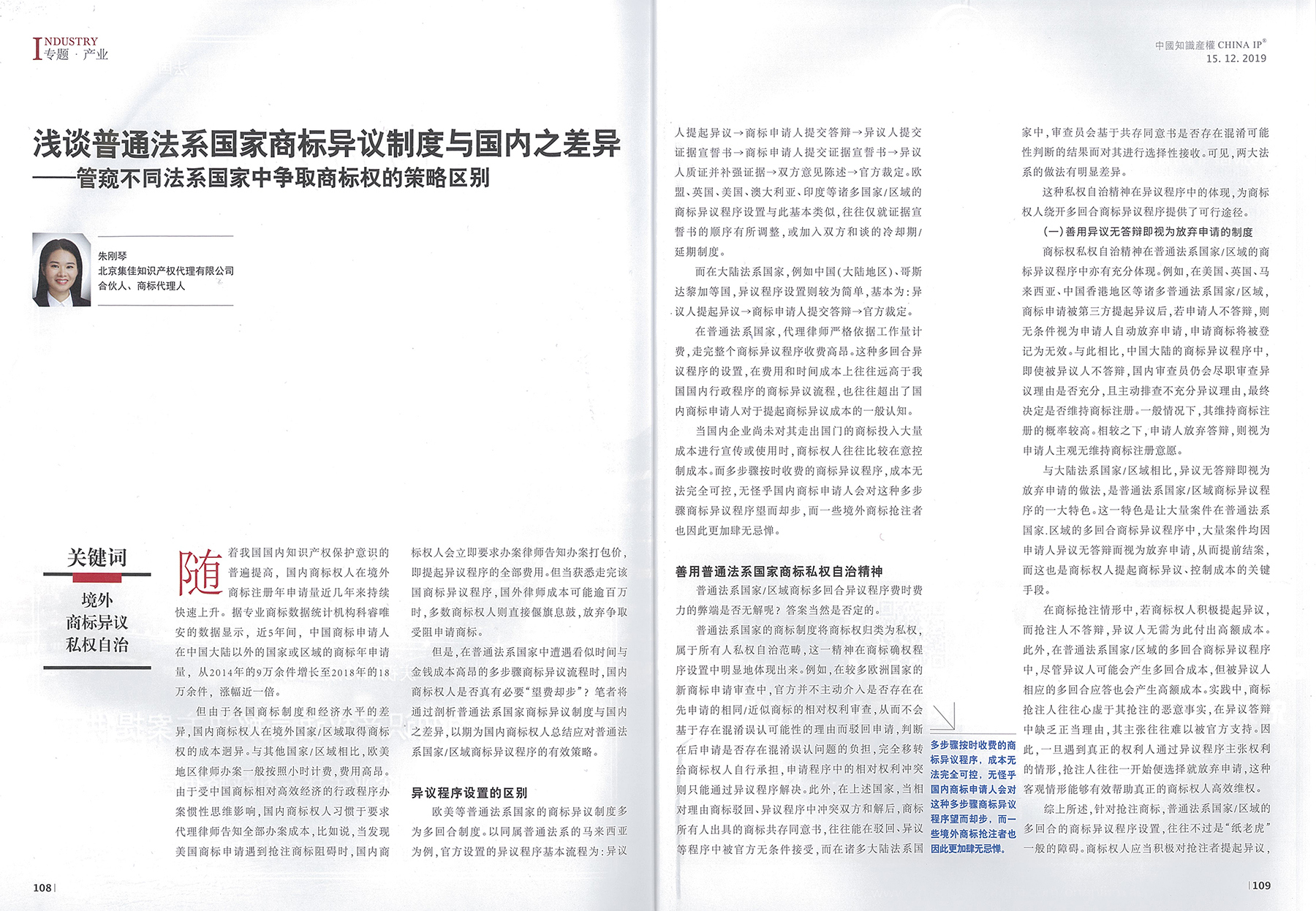 集佳文章《淺談普通法系國(guó)家商標(biāo)異議制度與國(guó)內(nèi)之差異——管窺不同法系國(guó)家中爭(zhēng)取商標(biāo)權(quán)的策略區(qū)別》在《中國(guó)知識(shí)產(chǎn)權(quán)》發(fā)表