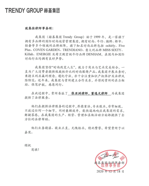 近日,集佳收到來自赫基集團的表揚信,信中,客戶對集佳張亞洲律師、董逸文律師的辛勤付出表示感謝,為他們細(xì)致高效的專業(yè)服務(wù)、敬業(yè)正直的工作態(tài)度點贊!
