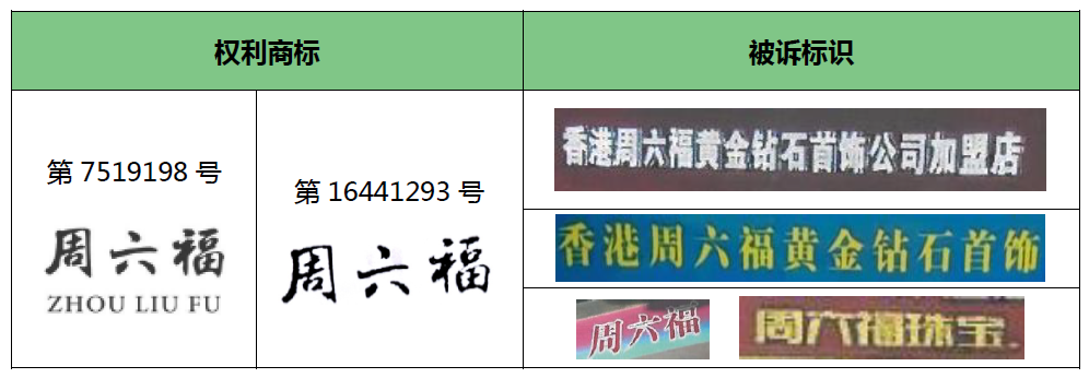 原審兩被告(中百珠寶首飾行和陳埭鎮周六福珠寶店)在其店鋪背景墻、店鋪招牌、首飾柜臺、首飾盒、廣告牌、包裝袋、首飾盒、質保單等多處使用上述被訴標識,其抗辯理由:一是此種使用方式系對特許人企業名稱的合理使用而非商標性使用行為;二是特許人享有在先使用權。一審判決認定突出使用“周六?!钡摹?a href="/res/unitalen/2206/22063849.png">