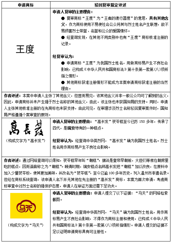 但是,只要與烈士名稱相同,則無(wú)法注冊(cè)為商標(biāo)使用嗎?當(dāng)然不是,以下將分別分析通過(guò)駁回復(fù)審予以駁回,以及通過(guò)駁回復(fù)審準(zhǔn)予注冊(cè)兩種情況,來(lái)明晰如何克服與烈士名稱沖突的商標(biāo)申請(qǐng)案件。