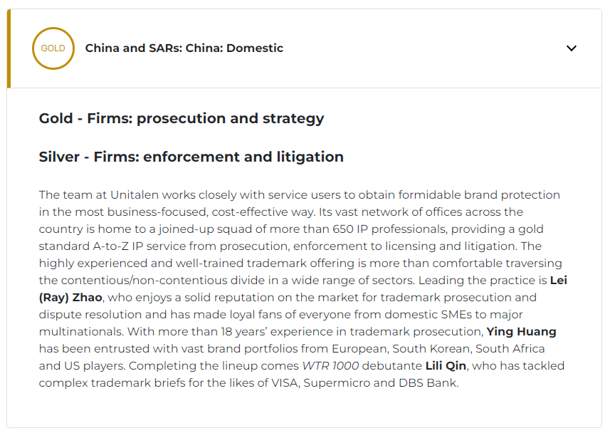 WTR評價:“作為團隊的領軍人物,趙雷律師在商標申請和爭端解決方面享有卓著聲譽,在從國內中小企業到大型跨國公司中都擁有的忠實擁躉。”
