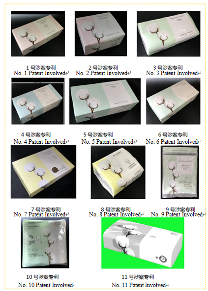 All the patents involved are outer packaging boxes and outer packaging bags of cotton soft tissue products, with similar design elements and design styles. In this regard, 10 patents have a filing date of June 5, 2017, and 1 patent has a filing date of January 10, 2019. None of the patents protects the color of the design.