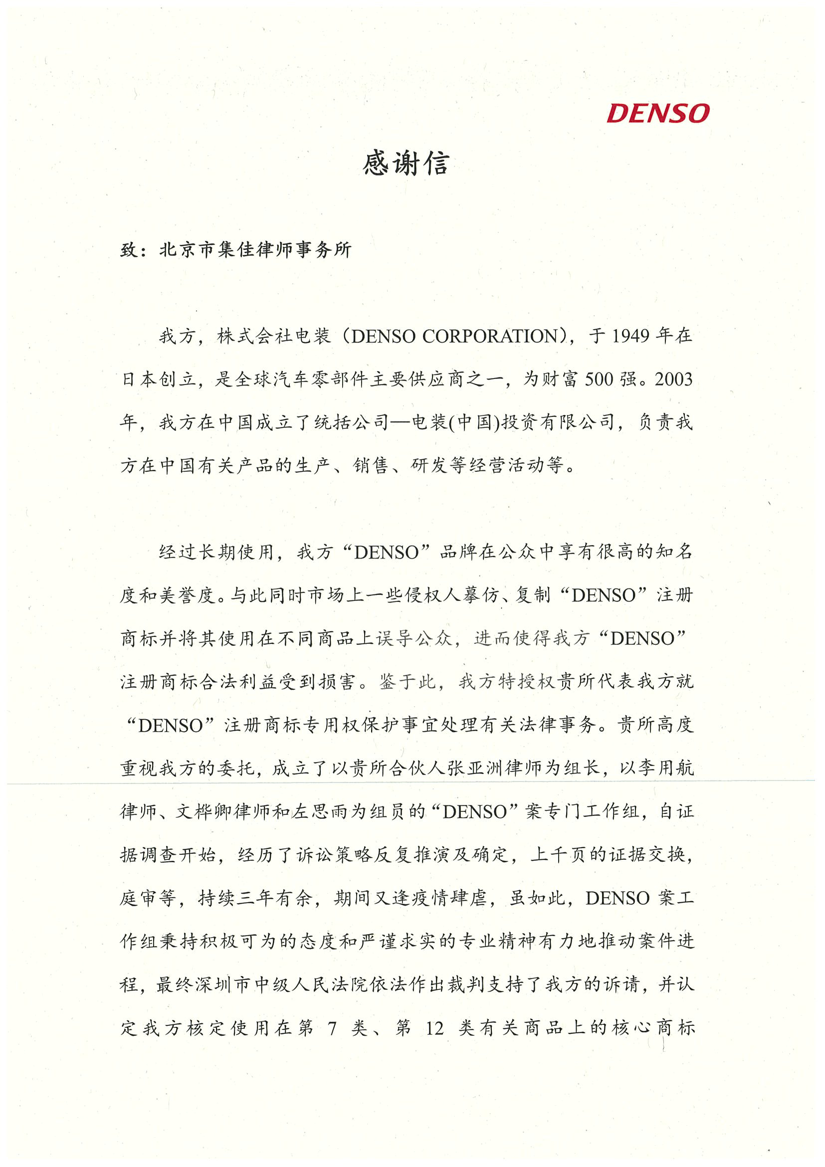 上述案件是“DENSO”注冊商標在中國首個實現跨類別保護的案件,通過該案,集佳成功代理客戶使其“DENSO”注冊商標獲得了與已有知名程度相適應的保護力度,有效地維護了客戶的合法權益。