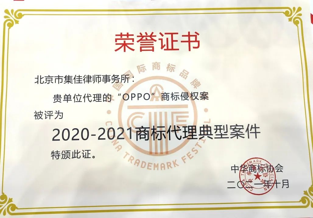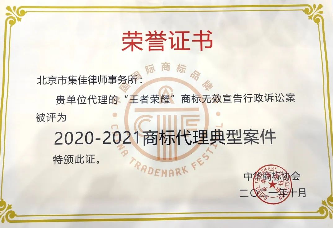 6月17日,第十三屆中國(guó)國(guó)際商標(biāo)品牌節(jié)正式拉開(kāi)帷幕,各項(xiàng)活動(dòng)火熱進(jìn)行。在“商標(biāo)典型案例評(píng)析論壇”上,集佳律師事務(wù)所代理的“第33類(lèi)‘王者榮耀’無(wú)效宣告行政訴訟案”和“OPPO侵權(quán)案”因其體現(xiàn)出的創(chuàng)新性、實(shí)效性、典型性和影響力,在眾多案例中脫穎而出,雙雙入選“2020-2021商標(biāo)代理典型案件”。