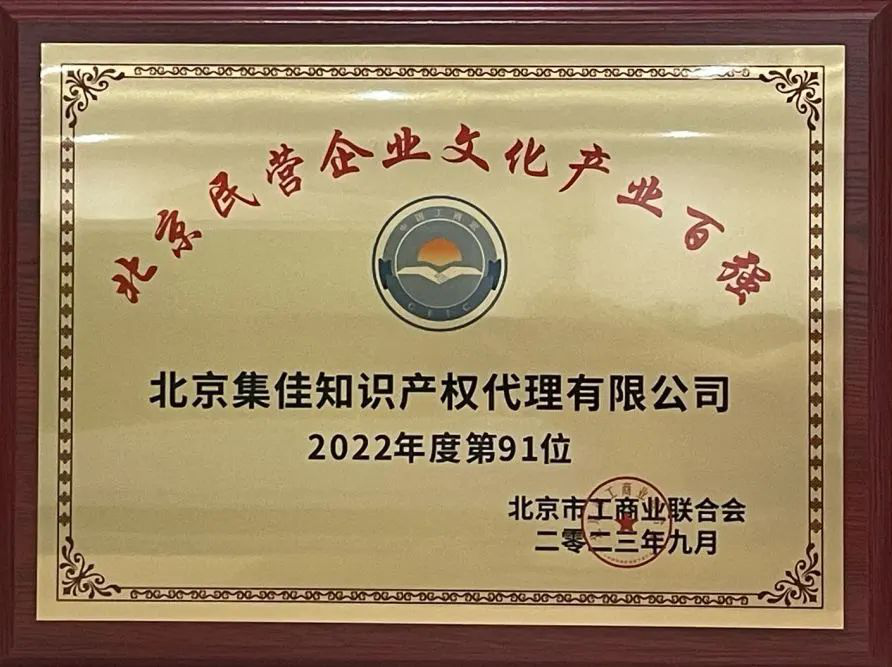 北京集佳知識產權代理有限公司憑借在知識產權領域29年的持續深耕,以及良好的企業社會形象榮登本年度“北京民營企業文化產業百強”榜,這是集佳首次入選北京民營企業百強榜單。