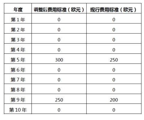 權項附加費(超過五個權項):25 歐元/項(當前為20 歐元)