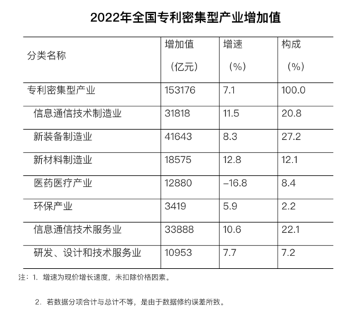經(jīng)核算,2022年全國專利密集型產(chǎn)業(yè)增加值為153176億元,比上年增長7.1%(未扣除價格因素,下同);占GDP的比重為12.71%,比上年提高0.27個百分點(diǎn)。