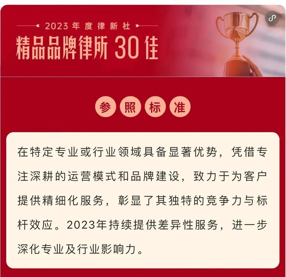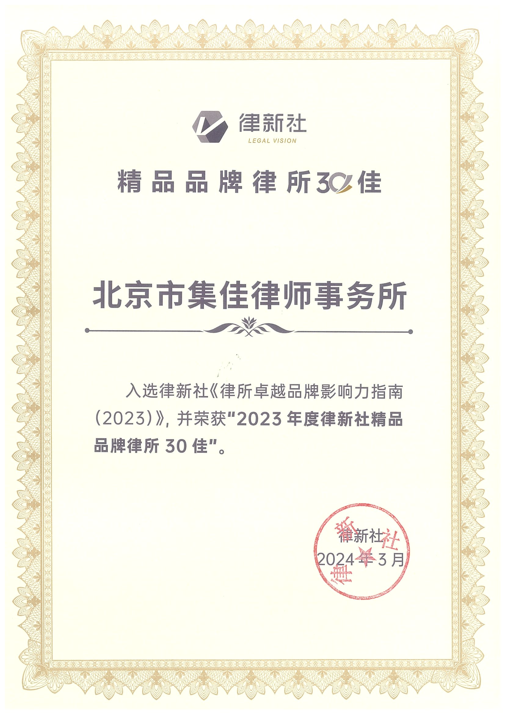 2024年3月2日,由中國法學(xué)交流基金會(huì)指導(dǎo)、律新社主辦的“致·追光者”第二屆法律服務(wù)業(yè)品牌發(fā)展論壇暨律新社2023年度品牌盛典隆重舉行,現(xiàn)場(chǎng)發(fā)布了備受關(guān)注的《律所卓越品牌影響力指南(2023)》,北京市集佳律師事務(wù)所憑借在知識(shí)產(chǎn)權(quán)領(lǐng)域的卓越實(shí)力和良好口碑,榮登“2023年度律新社精品品牌律所30佳”榜單。