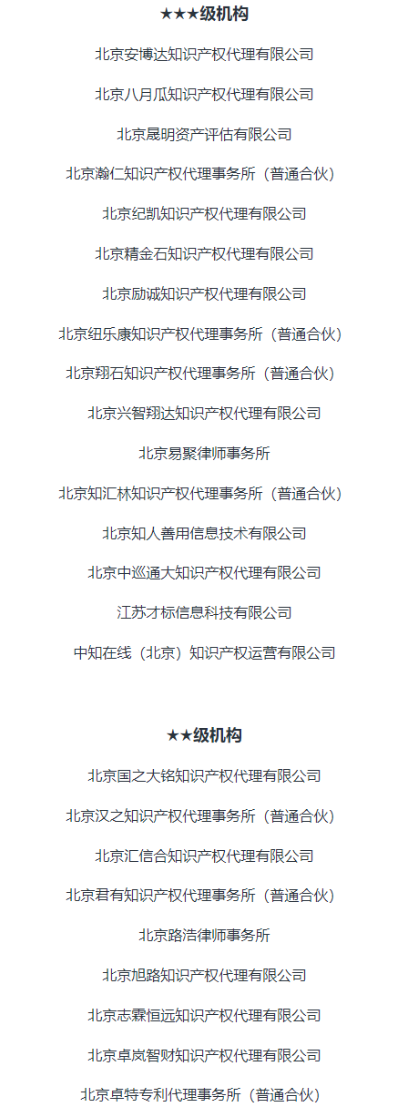首都知識產權服務業協會本次等級評定工作遵循公開、公正、透明的原則,嚴格按照標準評分要求,根據機構所提交材料信息及其完整度進行評定。經評審工作組初審、復審,專家書面評審及理事會審議,最終確定2023年度知識產權服務機構等級評定結果,其中AAAAA級機構19家,AAAA級機構16家,AAA級機構16家,AA級機構9家。