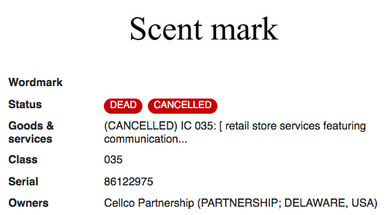 Verizon計(jì)劃將這種注冊(cè)商標(biāo)的香味推廣到其線(xiàn)下旗艦店。根據(jù)申請(qǐng)書(shū)的記載,此香味有助于將這些地點(diǎn)與“日益擁擠的其他通信和消費(fèi)電子產(chǎn)品零售商”區(qū)分開(kāi)來(lái)。該氣味商標(biāo)于2014年10月7日成為正式獲準(zhǔn)注冊(cè),該商標(biāo)目前已經(jīng)失效。