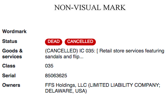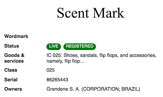 鞋類(lèi)連鎖店 Flip Flop Shops 在線(xiàn)下店鋪中使用的椰子香味已獲得商標(biāo)注冊(cè)。注冊(cè)人申請(qǐng)時(shí)提交了大量新聞報(bào)道,聲稱(chēng)這種香味是他們品牌的重要識(shí)別部分。其中一個(gè)例子寫(xiě)道,“從 15 英尺外走近,椰子防曬油的香味和充滿(mǎn)能量的音樂(lè)開(kāi)始刺激感官,讓潛在顧客興奮不已。”