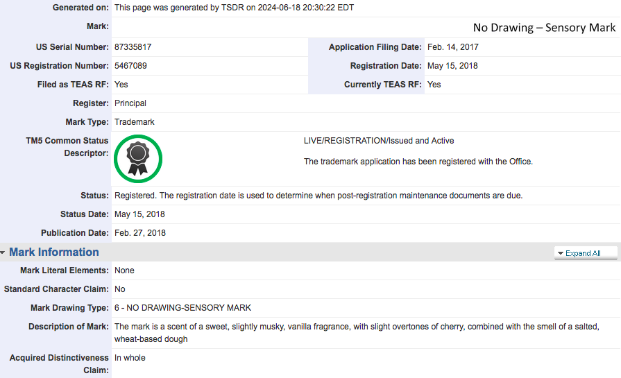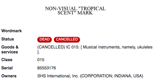 該公司將一種尤克里里琴型號(hào)所用的椰林飄香氣味成功申請(qǐng)為商標(biāo)。但在實(shí)際使用過(guò)程中卻面臨產(chǎn)品本身的問(wèn)題。運(yùn)往海外的尤克里里琴在運(yùn)輸過(guò)程中失去了氣味……所以當(dāng)海外客戶(hù)彈奏時(shí),它們聞起來(lái)就只是尤克里里琴的味道了。目前該商標(biāo)注冊(cè)已失效。
