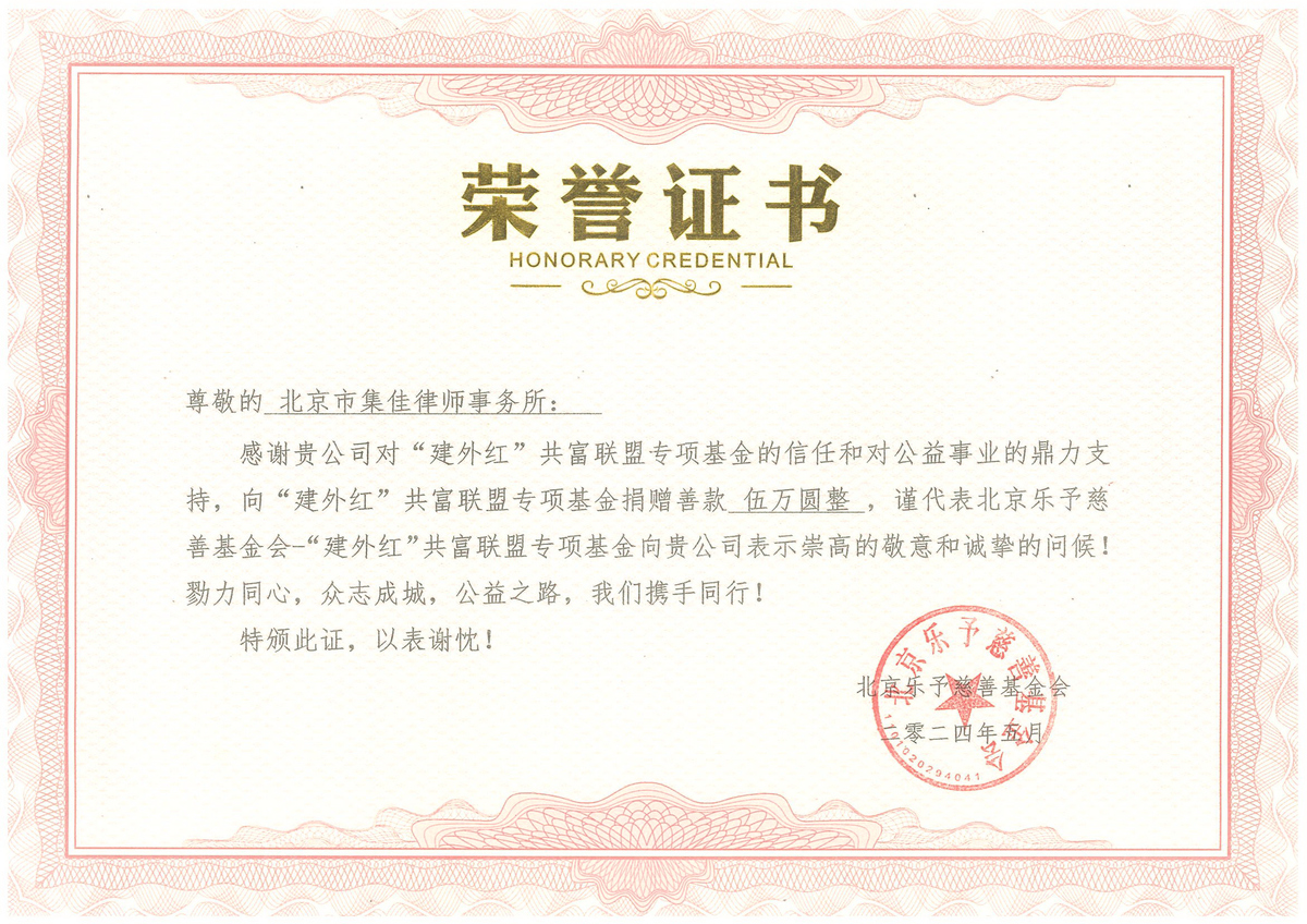 為了推動東西部對口幫扶工作深入開展,近日,集佳律所積極響應朝陽區建外街道的倡議,參與內蒙古烏蘭察布市察右后旗支援合作考察調研,并通過街道“建外紅”共富聯盟專項基金平臺捐資5萬元支持察右后旗鄉村振興建設。