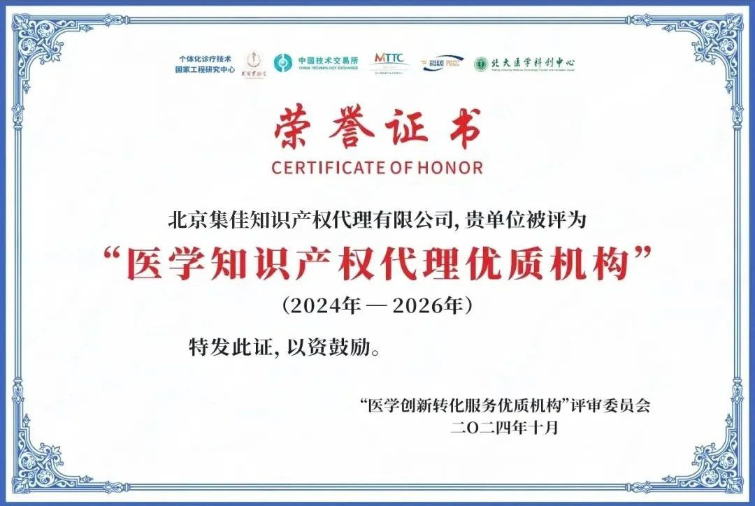 近日,2024年度“醫學創新轉化優質服務機構”遴選結果在海口舉辦的個體化醫學研討會暨第四屆衛生健康創新與轉化管理論壇上正式公布,北京集佳知識產權代理有限公司憑借在醫學創新成果知識產權保護與轉化方面的優秀成績,榮獲2024年度“醫學知識產權代理優質機構”稱號。