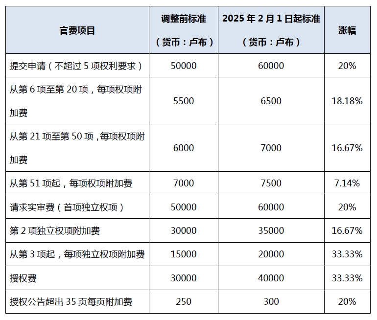 歐亞專利局于2025年1月14日公布通知,稱由于通貨膨脹與匯率波動,歐亞專利申請的部分費用將需要調(diào)整。目前調(diào)整后的費用已于2025年2月1日生效。