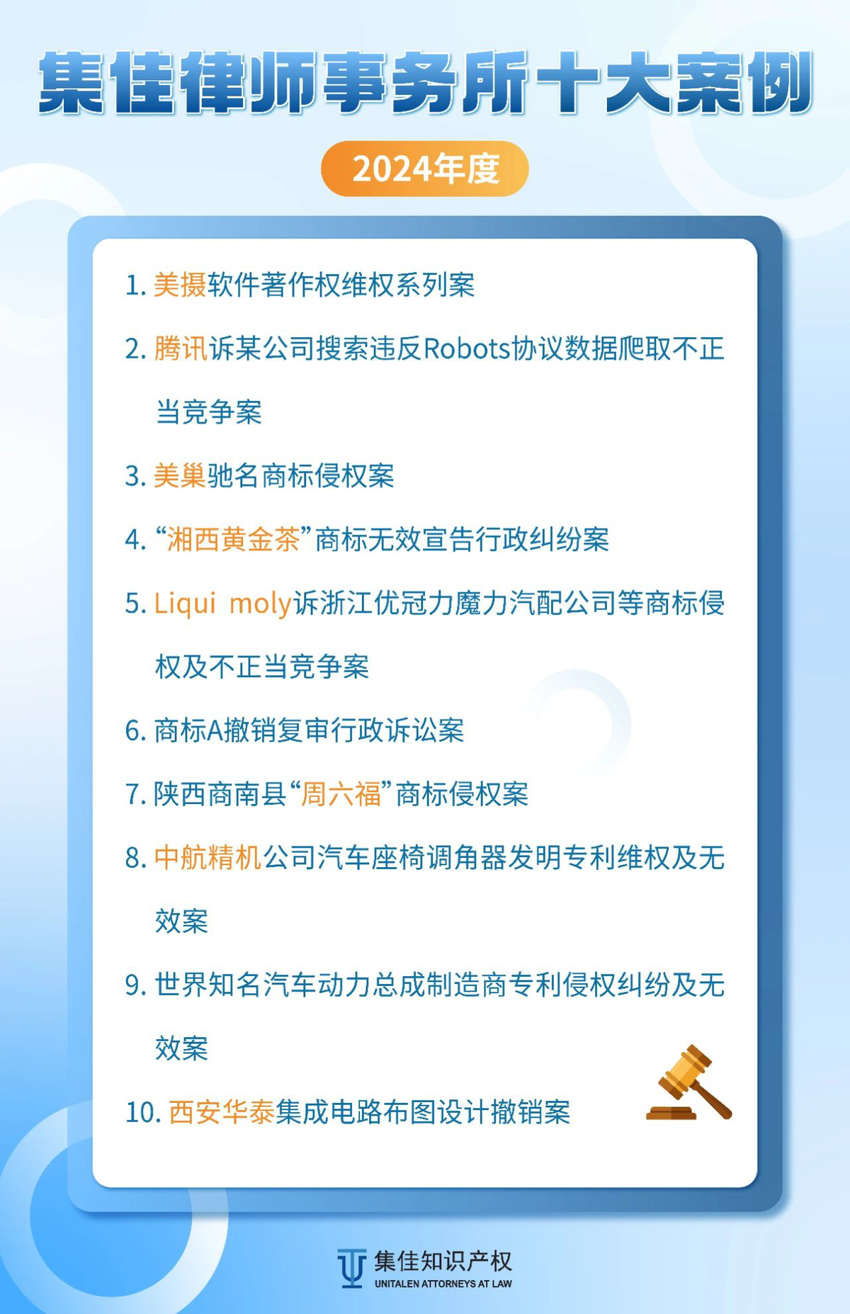 在世界知識產(chǎn)權日來臨之際,集佳律所從代理的眾多知識產(chǎn)權案件中篩選出2024年度具有代表性的十大案例,與各界同仁分享。這些案例具有較強的法律適用的典型意義和較大的社會影響,充分體現(xiàn)了國家知識產(chǎn)權保護的良好水平,體現(xiàn)了訴訟代理團隊的專業(yè)水準,同時也為與之類似案件提供了可資借鑒的維權范本。以下為2024年度北京市集佳律師事務所十大案例名錄: